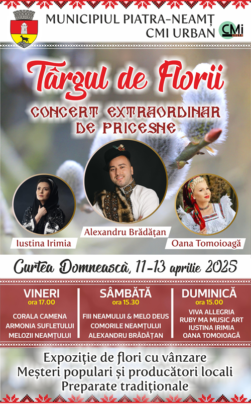 Dragi pietreni, mi-am dorit ca în apropierea sărbătorilor pascale, să unesc într-un eveniment de suflet, spiritul tradiției, frumosul, bucuria revederii și atmosfera primăverii! Timp de trei zile, în perioada „Târgului de Florii”, Curtea Domnească va prinde viață prin culoare, muzică, arome și oameni dragi. Veți descoperi aici producători locali, meșteri pricepuți, preparate tradiționale, expoziții florale care încântă privirea și, nu în ultimul rând, momente artistice de suflet. Pricesnele care vor răsuna pe scenă vor fi dar pentru inimă și o invitație la reflecție și liniște interioară, într-o perioadă în care ne pregătim să întâmpinăm Învierea Domnului. Vă aștept să întâmpinăm Sărbătorile Pascale împreună, cu inimile pline de bucurie!” a declarat Primarul Adrian Niță.