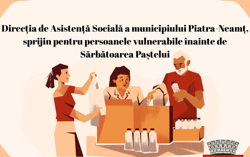 În preajma Sărbătorii Învierii Domnului, Direcția de Asistență Socială a municipiului Piatra-Neamț vine în sprijinul celor mai vulnerabili membri ai comunității, prin distribuirea de pachete cu produse alimentare și de igienă pentru 1.500 de copii și 1.500 de seniori. Acestea vor fi acordate în cadrul programelor „Sărbători pentru Seniori” și „Colorăm zâmbete de sărbători”, aprobate de Consiliul Local.