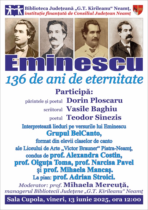 Biblioteca Județeană „G.T. Kirileanu“ Neamț organizează evocarea lui Mihai Eminescu la împlinirea a 136 de ani de la moartea acestuia, vineri, 13 iunie 2025, de la ora 12:00, în Sala Cupola.