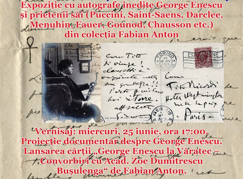 Biblioteca Județeană „G.T. Kirileanu“ Neamț organizează expoziția „George Enescu în județul Neamț. Expoziție cu autografe inedite George Enescu și prietenii săi (Puccini, Saint-Saëns, Darclée, Menuhin, Fauré, Gounod, Chausson, etc.) din colecția Fabian Anton“, în spațiul expozițional de la parterul Corpului A al bibliotecii, în perioada 25 iunie – 9 iulie.