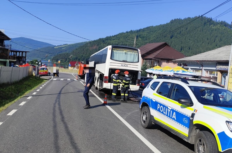 Un autocar cu turiști sârbi a luat foc în mers, la Poiana Teiului