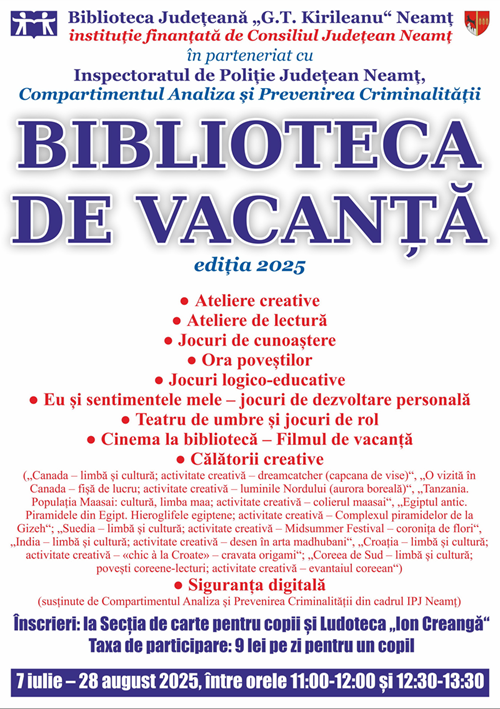 Biblioteca Județeană „G.T. Kirileanu“ Neamț organizează Biblioteca de vacanță, ediția 2025, în perioada 7 iulie – 28 august, constând în câte două ateliere pe zi, cu o pauză de 30 de minute, între orele 11:00 – 12:00 și 12:30 – 13:30, în zilele de luni, marți, miercuri și joi ale săptămânii.