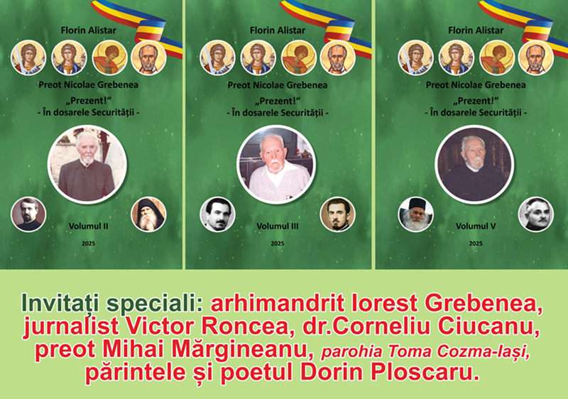 Biblioteca Județeană „G.T. Kirileanu“ Neamț găzduiește lansarea cărții „Preot Nicolae Grebenea «Prezent!» – În dosarele Securității“ de Florin Alistar, volumele I-V, joi 17 iulie 2025, de la ora 17:00, în Sala Cupola.