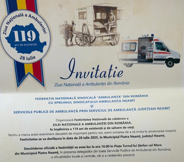 ”Din 2014, ziua de 28 iulie a fost legiferată ca fiind Ziua Ambulanței, iar din 2015 se sărbătorește. În principal, centrele universitare au avut onoarea de a organiza, în județul lor, Ziua Ambulanței. Am depus și noi cerere și iată că a zecea aniversare va fi la Piatra-Neamț. Vor fi alocuțiuni ținute de autorități, va fi prezentată istoria ambulanței de către domnul profesor dr. Grasu, după care se va pleca într-un marș al ambulanțelor pe bulevardele din oraș”, a declarat Florin Gust, liderul Sindicatului Ambulanța Neamț.