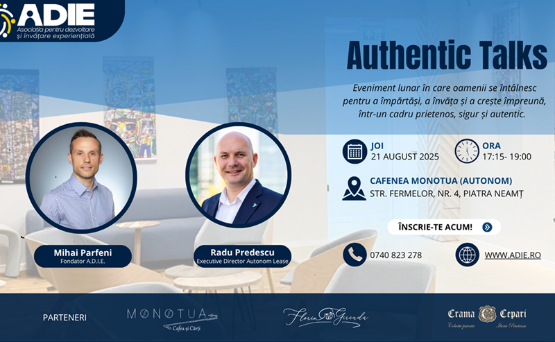 Joi, 21 august 2025, Cafeneaua Monotua – Dante (Autonom) din Piatra-Neamț găzduiește prima ediție a evenimentului Authentic Talks – Spațiul viu al dialogului, o inițiativă inedită, care aduce împreună oameni dornici de creștere personală, comunicare autentică și relații de calitate. Evenimentul este organizat de Asociația pentru Dezvoltare și Învățare Experiențială, un ONG local care își propune să creeze contexte reale de învățare, conexiune și inspirație în comunitățile din România.