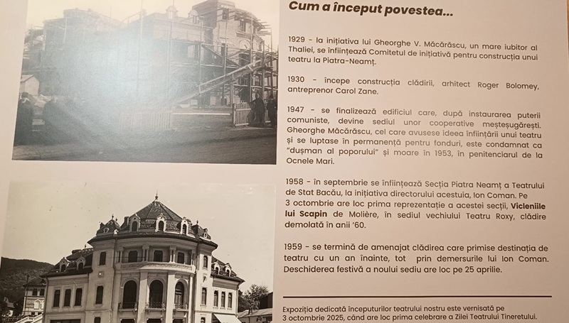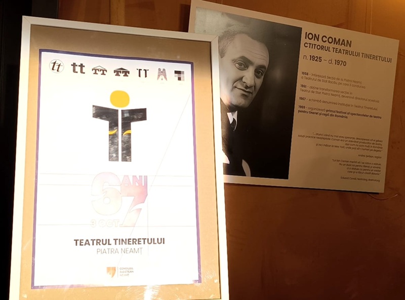 Aseară, consultantul artistic Raluca Naclad a vorbit despre istoria TT, începând cu omul care a avut ideea și dorința de a înființa un teatru la Piatra-Neamț: ”Sărbătorim pentru prima dată Teatrul Tineretului prin vernisarea expoziției ”Cum a început povestea”. Ne-am gândit să o luăm de la schele și nu se poate să nu amintim de omul care a avut ideea ca aici la Piatra-Neamț să existe un teatru. Este vorba despre Gheorghe Măcărăscu, deputat al Partidului Țărănesc în Parlamentul României în perioada interbelică, care în 1929 fondează un comitet de inițiativă. A început acest teatru cu banii lui și cu banii de la prietenii lui. Apoi, toată viața s-a chinuit să strângă fonduri ca să ridice această clădire. În 1947, după al doilea război mondial, clădirea era aproape gata, însă autoritățile comuniste au decis că aici nu va fi un teatru. Și au compartimentat clădirea pentru ateliere industriale, de vopsitorie și de tăbăcărie, mai târziu o cofetărie, un cinematograf, Librăria ”Cartea rusă,” care, bineînțeles, vindea cărți în special în limba rusă. Gheorghe Măcărăscu, care se chinuise o viață întreagă să ridice acest teatru, a intrat în pușcărie, condamnat politic, ca dușman al poporului, unde a și murit în Penitenciarul Ocnele Mari, în 1953. Așa e viața nedreaptă de multe ori. Se spune că Măcărăscu, oriunde auzea că e o premieră, acolo se ducea să vadă spectacole și din această mare iubire a lui s-a ridicat acest teatru, foarte iubit și în breasla teatrală, dar și de către spectatori. Așadar Măcărăscu n-a văzut că aici s-a deschis un teatru. Însă o altă personalitate providențială, Ion Coman, care ajunge în 1953 director al teatrului din Bacău, știa că la Piatra-Neamț trebuia să existe un teatru și să fie o clădire foarte frumoasă. Domnia sa a făcut toate diligențele, astfel încât a convins autoritățile comuniste să scoată tot ce era aici și să înființeze o secție a teatrului din Bacău. Așa am început noi în 1958. Și acest extraordinar Ion Coman a avut ideea genială, pe care n-a avut-o niciun alt director din spațiul teatral românesc, să creeze un teatru al tinerilor absolvenți. Și a luat promoțiile din 1957-1958 și a înființat aici la Piatra-Neamț primul nucleu de tineri actori. Din acea primă generație făceau parte Florin Piersic, Leopoldina Bălănuță, George Motoi, Cosma Brașoveanu și mulți, mulți alții care în timp au devenit vârfuri ale generației lor. Anul acesta sărbătorim și 100 de ani de la nașterea lui Ion Coman. El este ctitorul nostru, el a devenit directorul Teatrului de Stat Piatra-Neamț în 1961, deci i-a obținut și independența și tot el este cel care-i schimbă titulatura, în anul 1967, în Teatrul Tineretului”.