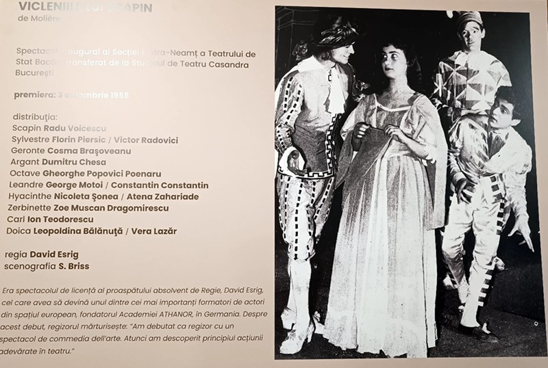 Profesor conferențiar-universitar dr. Paul Chiribuță, actor, directorul Festivalului de Teatrul Piatra-Neamț: ”Cred că sunt printre puținii din cei care au văzut acel prim spectacol al Secției Piatra-Neamț a Teatrului de Stat din Bacău, Vicleniile lui Scapin, în regia marelui David Esrig. Căile misterioase ale destinului fiecăruia, mie mi-au oferit o intrare regală în această lume a teatrului, prin acest spectacol. Un băiețel de 9 ani, provenit dintr-o familie fără tradiție culturală, am intrat, zguduit, aș putea spune, în această miraculoasă lume a teatrului. Această lume printre lumi, cum o numim noi. Am intrat atunci, pentru prima oară într-o sală de teatru pe care, fără să-mi dau seama, n-am mai părăsit-o niciodată. (…)
