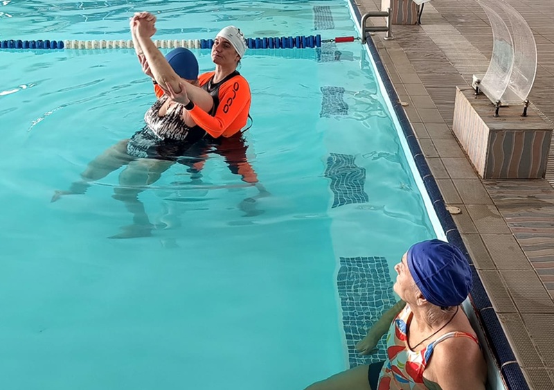 Atmosfera de la bazin e veselă. Emanuel, un domn care a venit în căruț cu rotile,  merge prin apă fără să se mai sprijine de margine. și le încurajează pe colegele lui de terapie să facă la fel: ”Am venit cu probleme mari la piciorul stâng. De la genunchi în jos era umflat ca un butuc. Glezna blocată total, rigidă. Mergeam cu bastonul șontâc, șontâc, dar pe măsură ce mergeam, mi se umfla glezna și riscam oricând să mă prăvălesc. Aveam și tromboză. Nu era mers, era o deplasare de necesitate, de urgență. Faptul că acum reușesc să merg la toaletă și nu depind de pampers, pentru mine a fost o mare realizare. Și am din nou poftă de mers. Înainte de AVC mergeam mult pe jos și-mi lipsea. Aici am mers fără să am teama că voi cădea. La mână mai trebuie să lucrăm și e dureros. Dar am mare încredere în domnul Zaharia. Este un om pregătit multidisciplinar și se dedică oricărui suferind”.