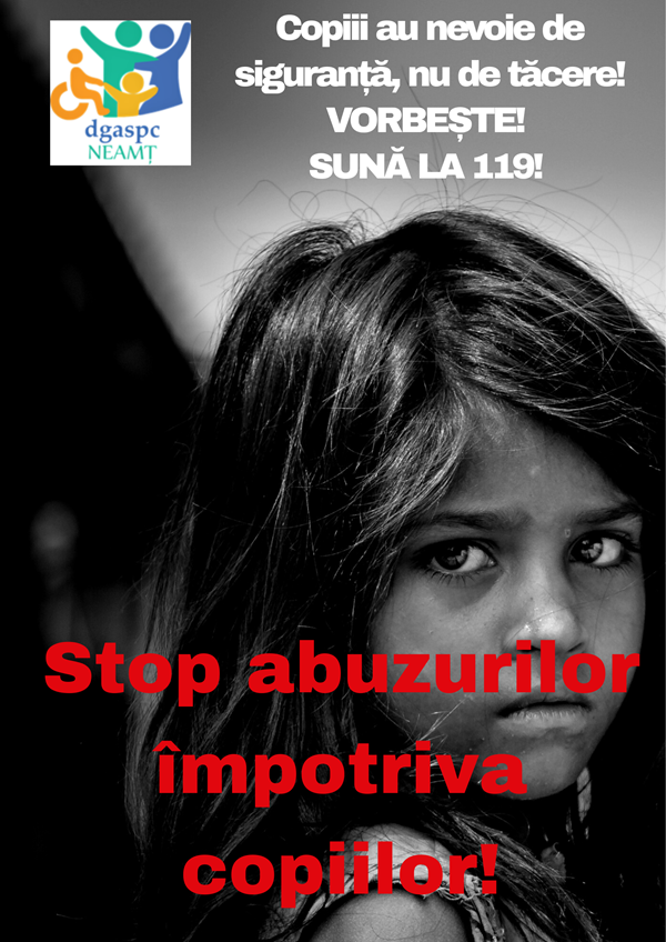 Cazurile de abuz, neglijare sau exploatare pot fi semnalate la numărul unic național 119 – Telefonul Copilului, disponibil non-stop, sau direct la DGASPC Neamț.
