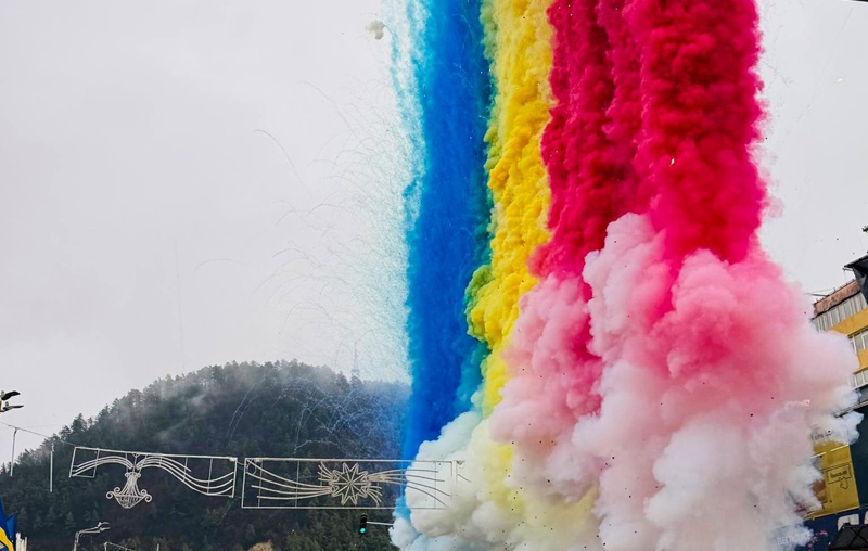 Discursul primarului a fost urmat de lansarea artificiilor tricolore, de care asistența s-a bucurat. Au fost și mici incidente, pentru că resturile au lovit pompierii așezați în formație, dar și o fetiță de 5 ani, din public, care a fost transportată la spital, având o arsură în zona feței.