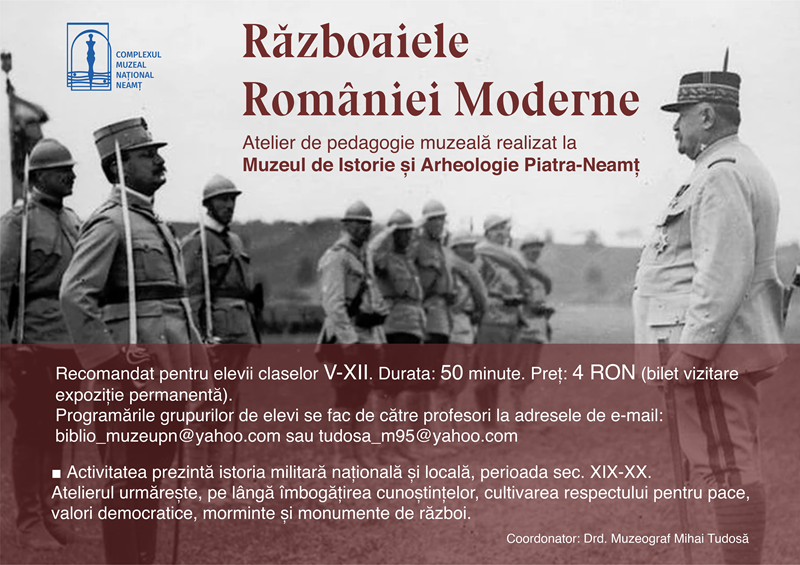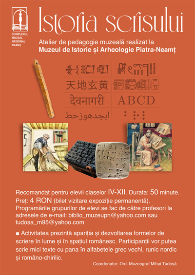Complexul Muzeal Național Neamț anunță desfășurarea începând cu data de 4 decembrie a.c. la sediul Muzeului de Istorie și Arheologie Piatra-Neamț a două ateliere de pedagogie muzeală. Cele două activități au ca tematici Istoria Scrisului, respectiv Istoria militară a României. Publicul-țintă al atelierelor îl constituie clasele de elevi IV-XII, care își pot completa astfel informația primită în cadrul orelor de curs, descoperind într-o manieră prietenoasă evoluția sistemelor și suporturilor de scriere, respectiv istoria conflictelor pentru independența, întregirea și apărarea statului român. De asemenea, atelierele au scopul de a dezvolta abilitățile practice, gândirea critică și respectul pentru trecut.