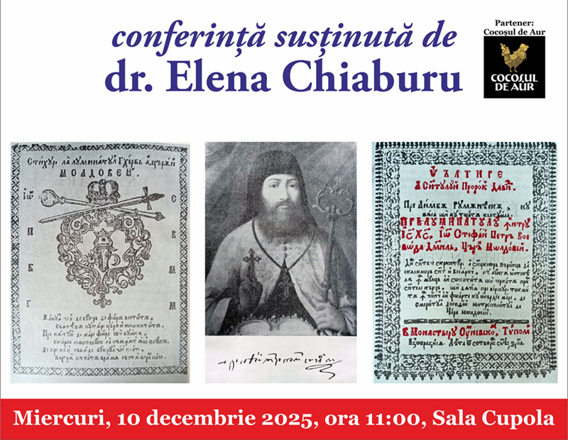 Biblioteca Județeană „G.T. Kirileanu“ Neamț organizează conferința „De pe bătrânele cărți de cult: Moldova în timpul Sf. Ierarh Dosoftei mitropolitul“, în cadrul Zilelor Bibliotecii, miercuri, 10 decembrie, de la ora 11:00, în Sala Cupola.