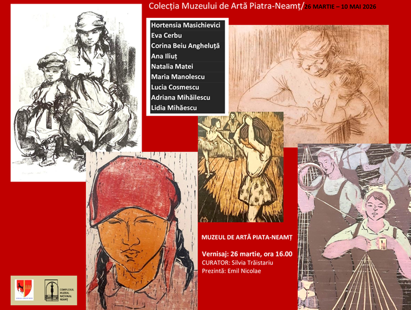 Muzeul de Artă Piatra-Neamț organizează, în perioada 26 martie – 10 mai 2026, expoziția “Ipostaze feminine în gravura realizată de artiste, 1956 -1963”, un demers curatorial ce propune recuperarea istoriografică a gravurii feminine și a contribuției semnificative pe care aceasta a avut-o în dezvoltarea gravurii românești.